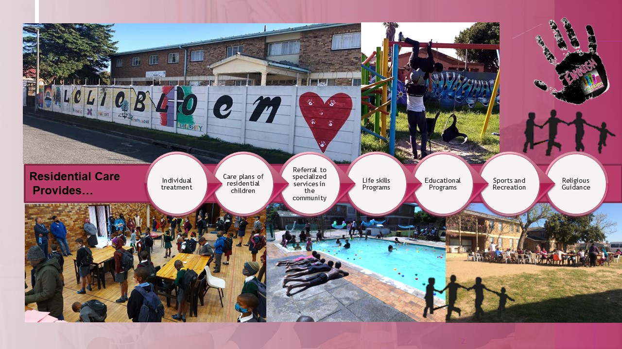 Besides the physical nurturing, love and security so important to these children, it is the intervention by means of counseling that is required to help them reach their full potential and break the cycle of abuse and poverty from where they come. This counseling would be either individual or in group sessions i.e. life and social skills, conflict resolution and capacity building. Outside of our own resources of in-house social and child and youth care workers, we utilize the services of volunteers, NGO’s and CBO’s. These would include Rape Crisis, Safeline, Child and Family Unit, Adolescent Unit and SANCA, hospitals and clinics. This project is fully committed to the concept and practice of Individual Treatment & Development Program.